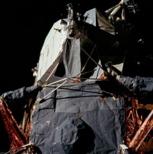 Rappelons que ces fragiles petites structures qui semblent faites de papier alu et de matériaux de récupération grossièrement rivetées et scotchées, étaient prétendument dotées de puissants moteurs propulseurs pour se poser en douceur sur la lune, puis en décoller à nouveau. Ils devaient aussi être pressurisées hermétiquement dans un environnement sous vide, à chaque fois que les astronautes y pénétraient après leurs sorties extra-véhiculaires.