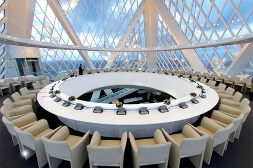 Juste au-dessus de l’opéra se trouve l’espace central de la pyramide. Elle sert de pièce de réunion pour les leaders religieux du monde qui participent à des conférences. Prenez une minute et imprégnez-vous du symbolisme qui s’y trouve. On a des leaders religieux du monde entier siégeant autour d’une immense représentation du Soleil, discutant pour savoir comment réconcilier les différences pour le Nouvel Âge à venir. Le symbole est flagrant : toutes ces théologies sont de simples excroissances de l’objet à l’origine de la dévotion : le Soleil. Cet espace est beaucoup plus lumineux que l’Opéra, il représente le progrès vers l’illumination. L’image du soleil au milieu de la table est exactement au sommet du soleil de l’Opéra. Alors tandis que le peuple en général se divertit dans l’obscurité du monde matériel, les soi-disant « illuminés », siégeant juste au-dessus d’eux au sommet, contemplent la manière d’atteindre la suprematie.