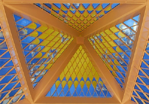 LA PYRAMIDE : Le bâtiment est dédié à la « renonciation de la violence » et « à réunir les religions du monde ». Norman Foster a dit que le monument n’a pas de symboles religieux reconnaissables afin de permettre une harmonieuse réunification des confessions. Comme l’a mentionné Manly Palmer Hall* dans « Enseignements secrets à travers les âges » : « La pyramide est le symbole ultime qui représente les mystères des anciennes civilisations. Sublime est leur simplicité, divines leurs proportions, elles incarnent à la fois la connaissance divine que possèdent les illuminés et la stupéfaction des masses ».