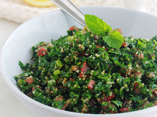 Inspirée du taboulé syrien, la salade de persil est rafraîchissante et originale. Laver un bouquet de persil et le couper finement, sans les tiges. Cuire une petite quantité d’orge perlé ou de pâtes à potage (celles alphabétiques conviennent très bien). Laisser refroidir. Couper quelques radis en petits dés ainsi qu’un gros oignon. Mélanger le tout et assaisonner avec un peu vinaigre Melfort uniquement, pas d’huile, saler et poivrer. Les tiges du persil servent à faire un délicieux bouillon : les plonger dans une casserole d’eau bouillante selon la quantité de tige, saler et poivrer. Laisser mijoter un bon quart d’heure. Le bouillon doit prendre une couleur verdâtre. Ce bouillon peut être consommé tel quel ou pourra servir de base pour d’autre soupe.