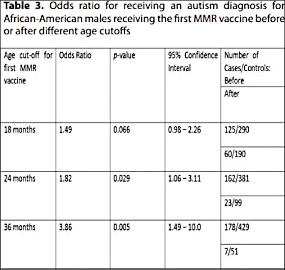 Si les vaccins ROR ne sont pas liés à l’autisme, toutes les valeurs de RO dans le tableau ci-dessus doivent être très proches de 1 (et les valeurs p doivent être >0,10) parce qu’il s’agit de mesures du moment de l’injection ROR (et non du moment du diagnostic d’autisme) qui doit être NON PERTINENTE si les injections sont sûres.