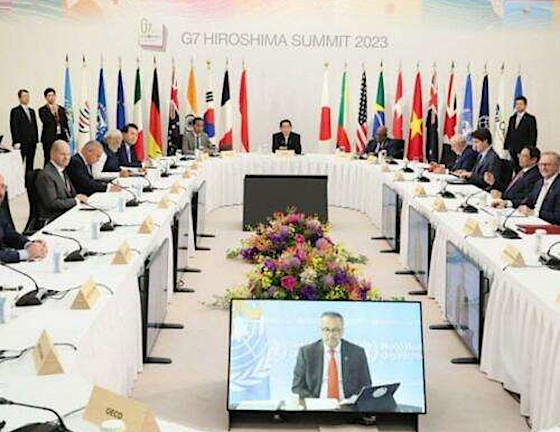- Hiroshima : le G7 en perte de vitesse, devenu G9 (avec l’ajout de deux bureaucrates non élus de l’UE), impose un ordre du jour unique : plus de sanctions contre la Russie, plus d’armes pour le trou noir en Ukraine et plus de leçons à la Chine.