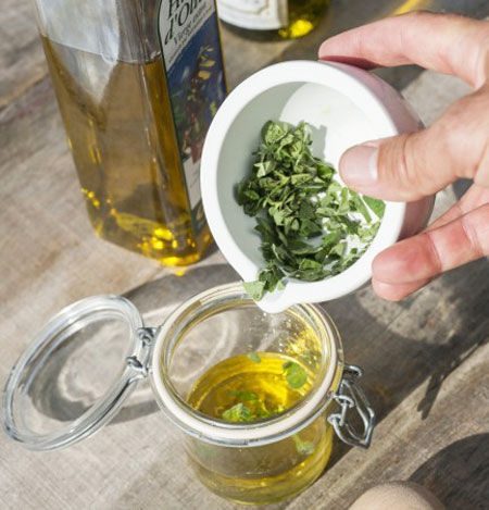 Mélanger 115 g de marjolaine fraîche légèrement pilée, 170 g de vin blanc et 450 g d’huile d’olive dans un bocal.