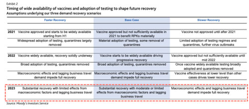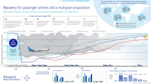 Moody’s prévoit que pour 2021 les revenus par passager-kilomètre n’atteindront que 40% des 8,7 trillions de 2019, ce qui est loin de la reprise en « V » que les marchés financiers mondiaux enregistrent actuellement en raison de plusieurs vaccins qui ont fait la une des journaux ces dernières semaines.