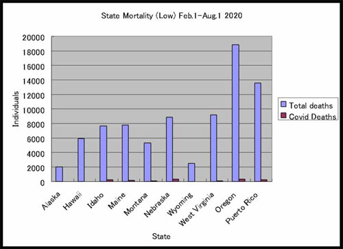 En revanche, examinons les États dont les données de morbidité sont les plus faibles. Le graphique suivant montre comment ces États se sont comportés en termes de mortalité globale par rapport au COVID-19. Il est clair que le COVID a joué un rôle mineur dans ces États. Veuillez noter que l’Alaska, Hawaï et le Wyoming ont connu quelques décès, mais ceux-ci ne découlent pas de la base de référence du graphique.