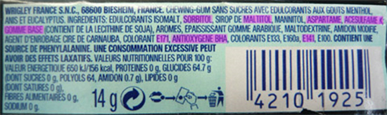On a repris la liste d’ingrédients d’un paquet de chewing-gums au hasard et avons mis en valeur les ingrédients néfastes ou du moins « à éviter » sur l’étiquette avec leurs descriptions au-dessous. Vous constaterez par vous-même que nombreux sont les ingrédients qui nuisent à la santé.