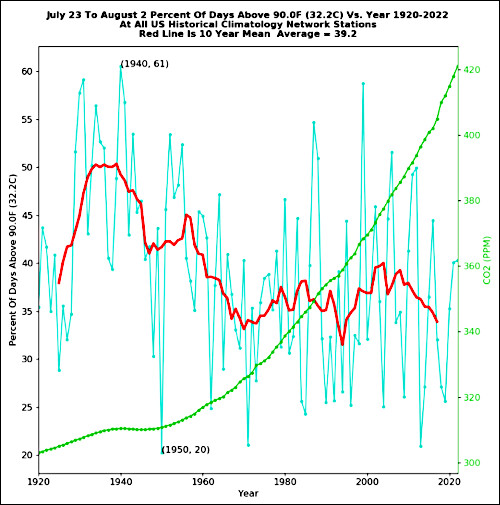 On remarque tout de suite un premier épisode de températures élevées entre la fin des années 1920 et le début des années 1960 dans le graphique « 35°C », épisode suivi d’une autre période « chaude » moins prononcée et plus courte dominée par un intense phénomène El Nino inhabituel de près de trois ans. Puis on ne peut que constater une chute progressive des températures matérialisée ici par une diminution du nombre de stations météo ayant enregistré une température de 35°C. La courbe rouge est une moyenne glissante sur dix ans de ces nombres de stations météo. L’autre graphique « 32,2°C » montre sans contestation possible une stabilisation de l’évolution de la température, comprenez du nombre de stations météo ayant enregistré une température de 32,2°C au cours des années depuis la fin des années 1940 ! Bien malin celui qui arrivera à comparer une telle courbe avec la fameuse crosse de hockey, fer de lance de la propagande des adeptes du changement, de la perturbation, de la déconstruction et que sais-je encore du climat, le tout d’origine humaine : de qui se moque-t-on ? D’autant plus que l’activité humaine s’est développée de manière exponentielle dès la fin des hostilités de la seconde guerre mondiale. Il reste enfin à noter dans ce graphique « 32,2°C » une totale décorrélation entre l’évolution des relevés des stations météo et l’augmentation de la teneur en CO2 atmosphérique telle que mesurée à l’observation hawaïen de Mona-Loa, bizarre, bizarre, n’ai-je pas dit bizarre…….