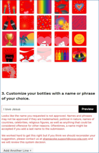 Dans plusieurs pays, vous pouvez commander des cannettes de Coca et les personnaliser. Plusieurs personnes ont apposé leurs noms, un mot quelconque, ou leurs dieux. Vous pouvez par exemple inscrire « Satan », « Allah », mais pas « Jésus » ou « I love Jesus », la plateforme reconnaît cela comme « inapproprié », ou, « non autorisé ».