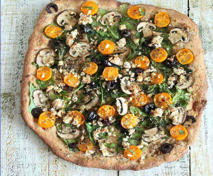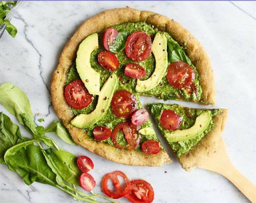Faites une purée d’une tasse d’épinards, 1/2 tasse de basilic, 1/4 tasse d’huile d’olive, 1/4 tasse de noix de cajou, le jus d’un demi citron et du sel. Étalez uniformément sur la base de pizza et faites cuire pour une dizaine de minutes. Après la cuisson, couvrez de tomate, avocat et flocons de piment rouge ou poivre de Cayenne pour ceux qui aiment manger piquant.