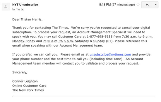 Le New York Times affirme qu’ils donnent un choix libre pour désinscrire votre compte