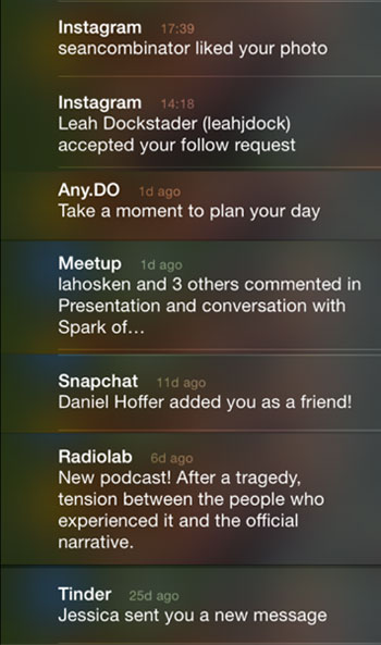 Voici une liste de notifications lorsque nous nous réveillons le matin , quel pouvoir à ce menu de choix dès lors que nous nous réveillons ? Est-ce qu’il reflète ce qui nous préoccupe ? (issu du discours de Joe Edelman sur l’Empowering Design)