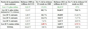 Evolution de la répartition des richesses aux USA de 1989 à 2021