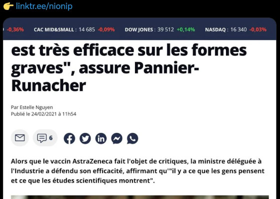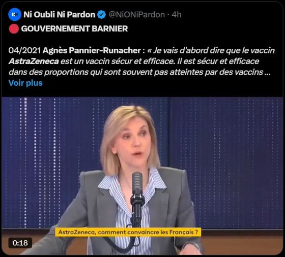 04/2021 Agnès Pannier-Runacher : « Je vais d’abord dire que le vaccin AstraZeneca est un vaccin sécur et efficace. Il est sécur et efficace dans des proportions qui sont souvent pas atteintes par des vaccins classiques. Je le redis parce que je crois que… pic.twitter.com/6JZDlcL8UY