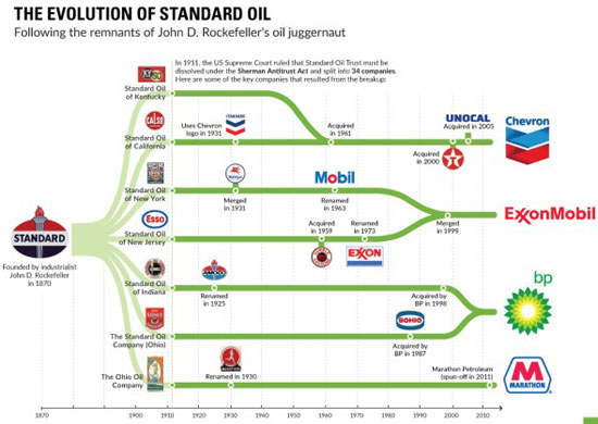 Au tournant du XXe siècle, il contrôlait 90% de toutes les raffineries de pétrole des États-Unis par l’intermédiaire de sa compagnie pétrolière, Standard Oil, qui fut plus tard démembrée pour devenir Chevron, Exxon, Mobil, etc.