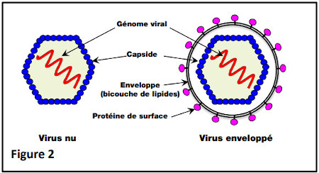 Les virus sont des agents infectieux constitués d’une coque protéique appelée capside, constituée de la juxtaposition d’un grand nombre d’exemplaires d’une protéine virale, et renfermant le matériel génétique du virus (Figure 2) qui est soit de l’ADN soit de l’ARN. De nombreux virus sont en plus entourés d’une enveloppe qui est constituée d’une bicouche de lipides correspondant à celle de la membrane plasmique de leurs cellules hôtes (les cellules qu’ils infectent) et contenant des protéines qui y sont enchâssées : les protéines de surface du virus (Figure 2). Les virus possédant une enveloppe sont appelés des virus enveloppés ; ceux n’en possédant pas sont les virus nus (Figure 2). Le virus SARS-CoV-2, responsable de la Covid-19, est un virus enveloppé, de même que le virus de la grippe ou le VIH, responsable du SIDA.