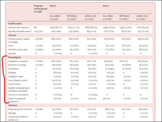 En 7 jours de suivi ils ont réussi à avoir, sur 5.597 vaccinées : 4 qui ont perdu la vue 7 incapables de marcher 91 infections respiratoires 1 paralysie soudaine du visage, 83 fausses couches (8 après 2ème trimestre post dose 1) 175 fausse couches (5,6% sur 3.114) entre dose 1 & 2. » Source : Patrice Gibertie