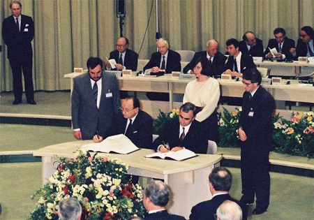 Simultanément en Europe de l’Ouest, le traité de Maastricht, qui est entré en vigueur en 1993, a été imposé aux États membres de l’Union européenne. Ce qui a été convenu d’appeler les critères de Maastricht (ou critères de convergence), qui ont finalement conduit à la formation de la zone euro, consistaient dans une large mesure à imposer le programme politique néolibéral aux États membres de l’UE. Les critères de Maastricht ont aussi porté atteinte à la souveraineté de chaque État membre.