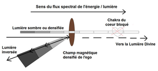 L’ego est de ce fait un champ magnétique piloté par de la « lumière sombre », distincte de la « véritable lumière divine » qui est le reflet du Soi supérieur (le supra-mental) nourri par le champ de l’Esprit universel (à partir de la 5-D). Il en découle que l’être humain est effrayé par sa propre lumière et non par son obscurité qui se confond, rendant de ce fait difficile le travail de rencontre avec l’ombre, son ombre, soit la force de prédation autrement nommée la Force des Ténèbres, pendant indispensable au fonctionnement équilibré du Vivant. Il en découle qu’il ne peut qu’avoir peur de la guidance de son Soi supérieur, car à travers ses croyances égotiques, il n’admet pas la réalité de quelque chose de plus infaillible et de plus grand que lui. C’est pourquoi lorsque l’ego persiste à lutter contre le courant naturel du flux de l’énergie (Cf. schéma ci-dessus), il peut aller jusqu’à en inverser son sens, générant ainsi la « lumière inversée » de laquelle naît l’illusion de la séparation et de la dualité *.