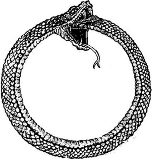Le serpent – l’ουροβορος (Ouroboros en grec) – représente la force universelle, la loi des forces physiques (électromagnétisme et nucléaire) équilibrées émanées de cette force, la marche du Mouvement et la production qui en résulte, la Vie. Il est un pentacle, c’est-à-dire une image de l’Absolu, l’Alpha et l’Oméga fusionnés. Dans le Monde Divin, il traduit l’action du Père – l’Absolu – sur le « Fils » – le Relatif –, le fruit de Ce Qui Est dans toute sa diversité. Dans le Monde Intellectuel, il est l’action de la Liberté sur la Nécessité. Dans le Monde Matériel ou Physique, c’est l’action de la Force sur la Résistance.