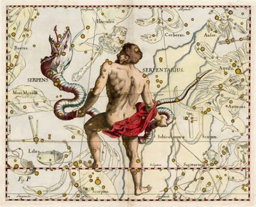 Il y a plusieurs types de reptiles dans le cercle du zodiaque, qui raconte une formidable histoire de régénération cosmique. Ainsi la constellation de l’hémisphère nord l’Ophiuchus, également connue sous le nom d’origine latine de Serpentaire, traversée par le Soleil du 29 novembre au 18 décembre. Elle se situe entre le Scorpion à l’ouest et le Sagittaire à l’est. Ophiuchus (le Serpentaire, le porteur de Serpents) est un médecin qui n’est absolument pas maléfique contrairement au Scorpion. Il symbolise la médecine et la science. Son venin est un anti-poison. Il protège également le Roi. Le serpent représente en fait l’inconscient humain, ce qui explique le culte du secret, cœur même du fonctionnement des sociétés secrètes et, plus globalement, des structures appartenant aux lignées des « élites » dont les membres au plus haut niveau doivent obligatoirement appartenir à la lignée des descendants de EA/Enki, le créateur de l’homme selon le mythe sumérien, mais soumis à l’influence de son frère tyrannique Enlil. Il est la treizième constellation du zodiaque, cachée à la connaissance de l’homme « vulgaire », car non initié. C’est la raison de la symbolique mystérieuse et source de fantasmes du chiffre 13, qui à l’instar de l’Arcane 13 du Tarot, peut être source de destruction (la « mort » de son union à son Soi supérieur, l’Esprit universel) ou de régénération salutaire (la mort du petit Moi, l’égo–mental). Selon la voie que l’être humain choisit lors de son parcours terrestre – résonance en mode « Service de Soi » ou « Service d’Autrui » –, il lui ouvre le chemin de son ascension de conscience, préparatoire à un changement de dimension de réalité, ou celui de son esclavage à la matière, prisonnier des boucles du temps (la roue karmique de Samsara) dans la Matrice de souffrance.
