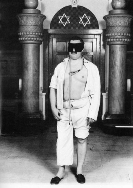 C’est une image d’un candidat à une initiation maçonnique. Après le rituel, son sein gauche et sa jambe gauche sont exposés tout en portant une corde autour de son cou.