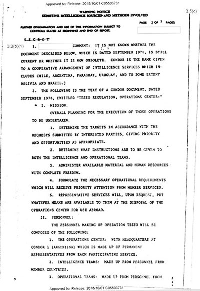 Le document informe le Centre d’opération que les services d’intelligence de cinq pays et « jusqu’à une certaine mesure du Brésil » ont signé en septembre 1976 un accord de coopération pour « des opérations contre des cibles subversives ». La CIA fait une distinction, jusqu’à présent inédite, dans la mécanique du « Plan Condor » en affirmant que « Condor » est le nom du pacte de coopération, qui s’appelle dans la pratique « Opération Teseo ».