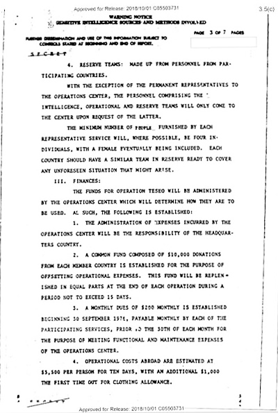 Les agents de la CIA en Argentine qui ont rédigé le Rapport affirment avoir vu une copie de l’acte original, qui commence par un paragraphe intitulé « Règlement de Teseo, Centre d’Opérations ». Le premier sujet est la définition de la mission, ce qui consiste à identifier des cibles « conformément aux demandes présentées par les participants, et de désigner des opportunités et des priorités ». Le Centre d’Opérations doit instruire les « équipes d’intelligence et d’opérations », les premiers sont en charge de trouver et d’identifier les cibles et les deuxièmes de les tuer et de s’enfuir.