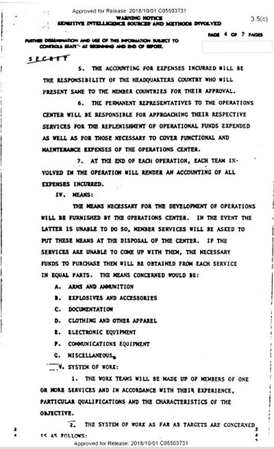 Chaque délégué présentait une « proposition d’opération » et la discussion sur l’opportunité, le coût politique et le matériel se terminait par un vote. S’il y avait un désaccord, un document était établi avec des copies pour chaque pays participant. Si une « opération » était approuvée la machine bureaucratique se mettait en marche, incluant des billets de transports et des indemnités de défraiement allant jusqu’à 3.500 dollars par jour pour les commandos comprenant jusqu’à cinq agents.