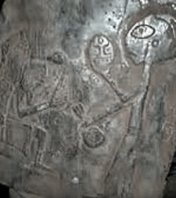 Après les avoir effectivement localisées, dans l’une d’elles, un métal ressemblant à de l’or aurait été trouvé et dans d’autres grottes, auraient été découvertes les pierres gravées. Une d’entre-elles représente ce qui pourrait être un vaisseau spatial ; sur d’autres on aperçoit nettement des visages E.T.
