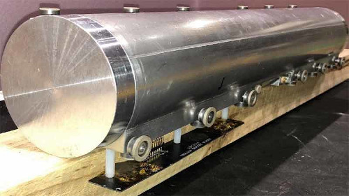 Système de chariot entièrement assemblé avec des roues montées sur des rails et le nouveau lecteur de code barre externe pour une mesure exacte de la position. La coque cylindrique de 50 cm de long contient les 17 sondes RMN et l’électronique de lecture et de contrôle fabriquée sur mesure. Crédit : Laboratoire national d’Argonne.