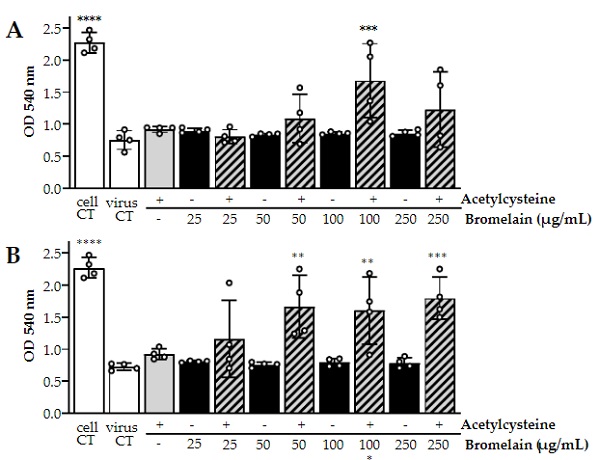Les essais de lyse cellulaire ont démontré le potentiel d’inactivation in vitro de l’acétylcystéine et du brome-laïne combinés (BromAc) contre le SRAS-CoV-2. La viabilité cellulaire a été mesurée par coloration des cellules avec du rouge neutre, la densité optique (DO) étant directement proportionnelle aux cellules viables. Une faible DO indiquerait une importante lyse cellulaire due à la réplication du virus.