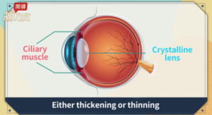 À l’inverse, lorsqu’il est relâché, il amincit le cristallin, ce qui permet de voir les objets éloignés. Cependant, chez les personnes âgées, le muscle ciliaire perd de son élasticité, ce qui entraîne une difficulté à le contracter et, en fin de compte, une difficulté à voir les objets à proximité.