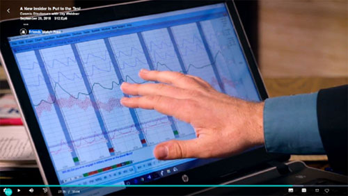 C’est en fait l’ouverture et la fermeture de glandes sudoripares de nos doigts. Juste en dessous, on voit les modifications de la pression sanguine, du rythme cardiaque, etc. En dessous sur l’écran, on voit les résultats de la PPG ou de la photoplethysmographie Il s’agit de la dilatation et du resserrement des vaisseaux sanguins dans la pointe des doigts.