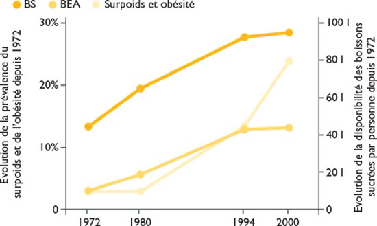 Figure 1. Evolution de la fréquence de consommation de boissons sucrées (BS) et de boissons édulcorées artificiellement (BEA), ainsi que de la fréquence du surpoids et de l’obésité aux Etats-Unis entre 1972 et 2000