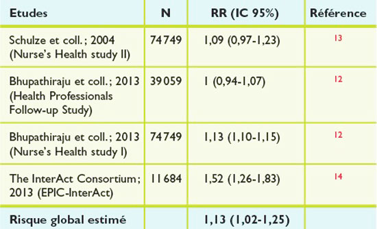 Tableau 2. Résumé de quatre études observationnelles portant sur le risque relatif (RR) et l’intervalle de confiance (IC) de développer un diabète de type 2 chez les consommateurs de boissons édulcorées