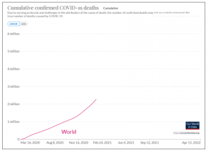 La courbe (en rose) montre le nombre de décès attribués au covid, dans le monde par les autorités sanitaires officielles, depuis le début de l’épidémie en mars 2020 jusqu’au moment où ont débuté les campagnes massives de vaccination[3].