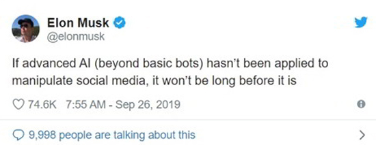 « Si l’IA avancée (au-delà des robots de base) n’a pas été appliquée pour manipuler les médias sociaux, elle ne tardera pas à l’être », a tweeté Musk.
