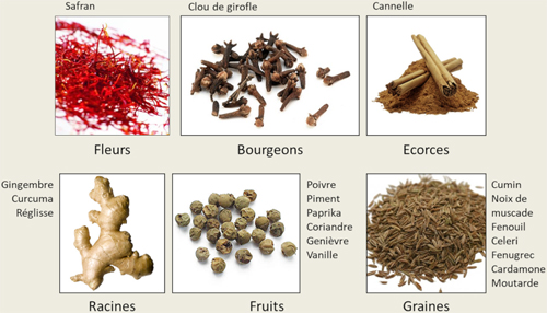 Les épices sont utilisées en petite quantité en cuisine, essentiellement pour parfumer et assaisonner les plats, parfois pour leur donner de la couleur ou favoriser leur conservation. Dans les épices, les principes actifs peuvent être présents dans la fleur (safran), le bourgeon (clou de girofle), l’écorce (cannelle), la racine, le fruit (poivre, aneth, moutarde), de rhizomes (gingembre) ou les graines (fenouil, coriandre, muscade) du végétal.
