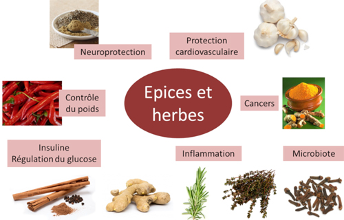 Devant l’incidence croissante des maladies à composante nutritionnelle, les bénéfices potentiels des herbes et des épices sur le plan biologique et clinique font l’objet d’une recherche très active. L’essentiel de ces recherches porte sur l’impact des épices et herbes aromatiques dans l’obésité, les maladies cardiovasculaires, les maladies inflammatoires et les dysbioses.