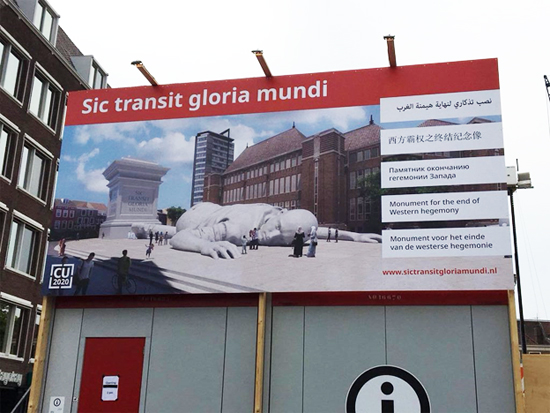 La ville d’Utrecht (Pays-Bas) est en train de bâtir une statue symbolisant la chute du « mâle blanc ». Sur Twitter, on retrouve également mention d’une telle construction, mentionnée par le compte identitaire @DefendEuropa. Selon @DefendEuropa, les panneaux pris en photo « font la promotion d’une statue d’un homme blanc chutant et accompagné des mots “ Sic transit gloria mundi ” (Ainsi passe la gloire du monde) ».