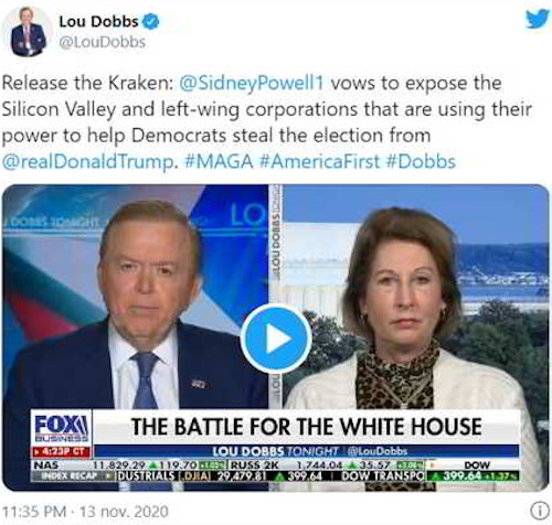 « Je vais relâcher le Kraken. […] Le président Trump a gagné de façon écrasante. Cela va être irréfutable »