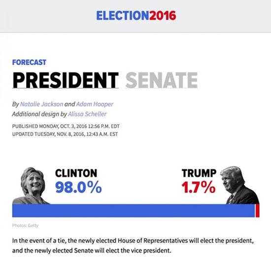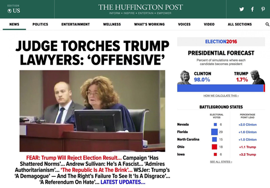 David a capturé une photo de la première page de Huffington Post, maintenant contrôlée par Verizon, le jour du scrutin. Cela démontrait une probabilité de 98% pour Hillary à gagner et une chance de 1,7% pour Trump.