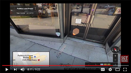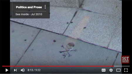 Ces deux captures d’écran d’une vidéo de Sgt Report révèlent qu’un symbole de « mort » de crâne et os croisés, était clairement visible sur le trottoir en face de Politics & Prose depuis juillet 2010. (https://www.youtube.com/watch?v=OsH5_nUFS70&feature=youtu.be&t=7m50s) Ce symbole était facilement visible dans une recherche Google Maps Street View :