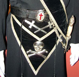 Le tablier maçonnique du 32e degré présente également ce symbole Templier. La version de l’ère 1800 du tablier avait un crâne métallique et les os croisés :