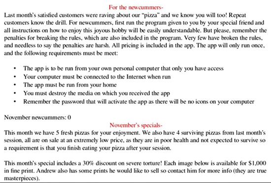 Des pirates de 4Chan ont déclaré avoir trouvé un espace secret avec vidéos encryptés sur le serveur du site internet de Comet Pizza. Bien qu’ils n’aient pas pu décrypter les vidéos, ils ont été capables d’extraire une image accompagnée d’un texte qui donnait des instructions à ceux qui accédaient à ces vidéos. Les instructions étaient écrites en langage codé parlant d’une application que les abonnés pouvaient télécharger et utiliser une seule fois uniquement.