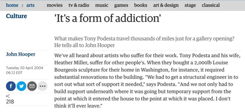 « [Les Podestas] sont connus pour l’achat d’œuvres bizarres, telles que des installations vidéo, que beaucoup d’autres collectionneurs privés ne considéreraient même pas. Il est facile de les entreposer, mais il est difficile de les exposer », dit Podesta.