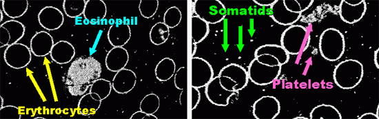 Le grand avantage du Somatoscope c’est qu’il permet de découvrir le fonctionnement dynamique des matières vivantes. Grâce à cet instrument unique, on peut voir carrément l’intérieur des cellules vivantes. Il offre par exemple une vision fascinante de l’activité de certains globules blancs : non seulement on voit le mouvement semblable à celui des amibes de ces cellules, mais on voit aussi chaque granule individuel (lysosome) à l’intérieur des granulocytes se déplacer, vibrer, émettre des pulsations. Par comparaison, ce que l’on voit dans un microscope traditionnel n’est que matière inanimée.