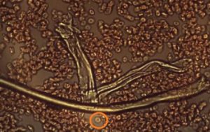 Quelques semaines avant la réalisation de la vidéo, le Dr Philippe a commencé à remarquer un effet de polarité magnétique ou électrique sur différents côtés des fibres de graphène. Dans l’image ci-dessous, à droite de la fibre, les cellules sont coagulées et sur le côté gauche se trouve ce qui ressemble à un espacement ou à un espacement en forme de « C » à peu près à l’envers. Le Dr Philippe dit que ce « comportement » n’était pas observé auparavant, mais que maintenant, tout à coup, il est observé dans presque tous les échantillons. C’est une indication que « ces choses ont changé, leur réaction avec les cellules sanguines environnantes a changé… et je ne sais pas ce qui l’a autorisé », at-il déclaré.