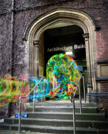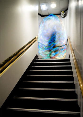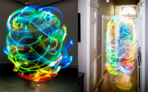 Comme fonctionne l’appareil Kirlian Device ? L’appareil transforme la puissance du signal en plusieurs couleurs selon son intensité (rouge pour la haute intensité, bleu pour la faible intensité). Luis Hernan déplace ensuite son appareil autour de lui et photographie la scène avec une vitesse d’obturation longue. Le résultat donne ces images de spectres colorés.