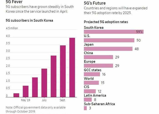 Comme on pouvait s’y attendre, la Corée du Sud est beaucoup plus avancée et a atteint plus de 4,5 millions d’abonnés sur une population de 51 millions d’habitants à la fin de 2019, selon les analystes des télécommunications interrogés par le Wall Street Journal.